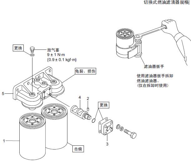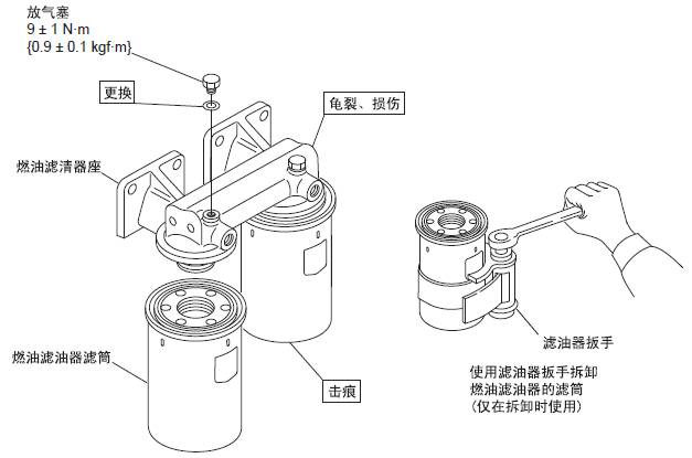 2.1 三菱S6R發(fā)動(dòng)機燃油濾清器的解體,檢修,組裝( 紙質(zhì)濾芯)