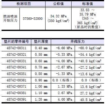 (3) 噴油開(kāi)始壓力通過(guò)增減墊片調整。墊片分0.40 ~1.20 mm 的9 種。參照下表進(jìn)行調整。