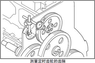 測量正時(shí)齒輪的齒隙,將千分表的表頭放置在齒輪節圓的圓周線(xiàn)上,與齒面垂直接觸,測量齒隙量,或在各齒輪的嚙合部分插入厚薄規進(jìn)行測量。超過(guò)極限值時(shí)更換新的齒輪。