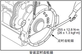 (3) 在正時(shí)齒輪箱上安裝吊具,對準定位銷(xiāo)后,安裝正時(shí)齒輪箱。