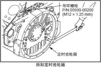 (2) 將三菱S12柴油發(fā)動(dòng)機正時(shí)齒輪箱吊住并向外移動(dòng)至脫出定位銷(xiāo)后拆下。