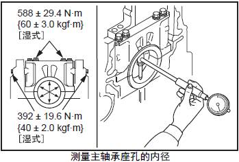 測量三菱S12柴油發(fā)動(dòng)機主軸承瓦座孔的內徑 (1) 將三菱S12柴油發(fā)動(dòng)機主軸承瓦端蓋按照規定方法安裝在三菱S12柴油發(fā)動(dòng)機缸體上。 注: 三菱S12柴油發(fā)動(dòng)機主軸承瓦端蓋的緊固要領(lǐng),參照「三菱S12柴油發(fā)動(dòng)機本體的組裝」的「安裝三菱S12柴油發(fā)動(dòng)機主軸承瓦端蓋」項。