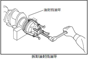 用齒輪拆卸器將三菱S12柴油發(fā)動(dòng)機油封擋油環(huán)從三菱S12柴油發(fā)動(dòng)機曲軸上拆出。