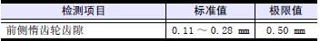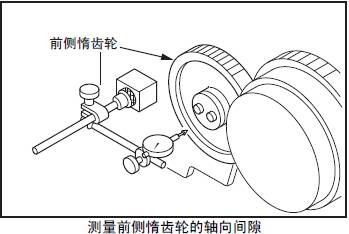 測量前側惰齒輪的齒隙,將千分表的表頭放置在齒輪節圓的圓周線(xiàn)上,與齒面垂直接觸,測量齒隙量,或在各齒輪的嚙合部分插入厚薄規進(jìn)行測量。超過(guò)極限值時(shí)更換新的齒輪。