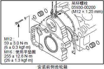(1) 在三菱S12柴油發(fā)動(dòng)機缸體的前側齒輪箱墊片安裝面上涂抹密封劑(ThreeBond 1211),貼上墊片。在墊片上涂抹密封劑(ThreeBond 1211),安裝前側齒輪箱。