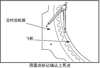 (3) No.1 三菱S12柴油發(fā)動(dòng)機氣缸上死點(diǎn)的確認方法是,在三菱S12柴油發(fā)動(dòng)機飛輪端面和三菱S12柴油發(fā)動(dòng)機正時(shí)齒輪箱上打刻有圓點(diǎn)標記,當3 點(diǎn)之間的距離相同的時(shí)候,既是No.1 三菱S12柴油發(fā)動(dòng)機氣缸的上死點(diǎn)。
