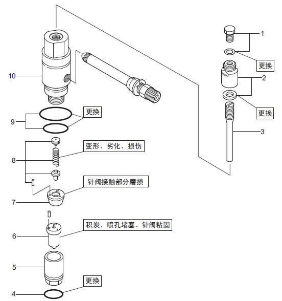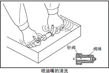 (5) 調整和清洗后噴霧狀態(tài)不能好轉的話(huà),要更換新的噴油嘴。新的噴油嘴涂有防銹劑,最初一定要用清洗油清洗,然后用柴油再次清洗后才能組裝。