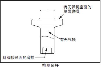目測檢查頂桿,發(fā)現彈簧座單側磨損、針閥接觸面顯著(zhù)磨損或下面錐部氣蝕時(shí)更換新的頂桿。