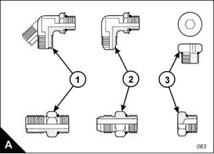 Examples of relevant fittings are shown (A): ‘O’ ring face seal (A1), 37 degree flare (A2) and plug with a