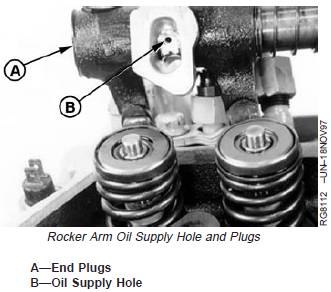 IMPORTANT: The oil supply hole (B) on the rockerarm shaft must be toward the flywheelend of the engine.
