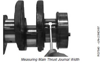 1. Measure and record crankshaft main thrust journalwidth.If crankshaft thrust journal width is not within specifications, install a new crankshaft.