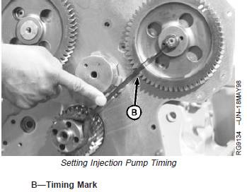 9. Turn left (injection pump side) balancer shaft so timing mark on gear is aligned with JD254A (JD-254A) Timing Tool (A).
