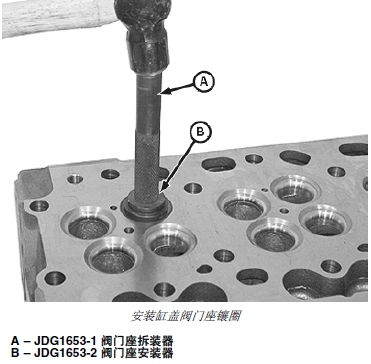 1. 用 JDG1653-1 閥門(mén)座孔拆裝器(A) 和 JDG1653-2 閥門(mén)座孔鑲圈安裝器(B) 安裝缸蓋閥門(mén)座孔鑲圈。用 JDG1653-2 閥門(mén)座安裝器的一端安裝進(jìn)氣閥門(mén)座鑲圈,用另一端安裝排氣閥門(mén)座鑲圈。