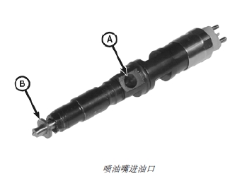 6. 安裝噴油嘴線(xiàn)束,用螺母(A) 將導線(xiàn)固定在噴油嘴上,并用螺釘 (B) 將導線(xiàn)接頭固定在搖臂支架上。(參見(jiàn) CTM230 (配有 Denso 高壓共軌的 11 級電子燃油系統)第 02 部分第 090 章的“安裝電子噴油嘴”部分。)