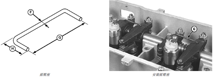 重要提示: 安裝過(guò)程中,放松搖臂上的調節螺釘可避免損壞搖臂軸。為有助于安裝搖臂軸總成,要使用搖臂座(E),如圖所示。