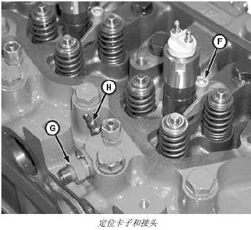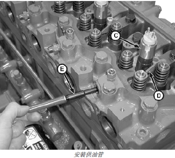 2. 安裝噴油嘴,將噴油嘴的固定卡子(D) 固定在缸蓋上。安裝后,噴油嘴的的進(jìn)油口 (A) 一定要對著(zhù)供油管 (E)。