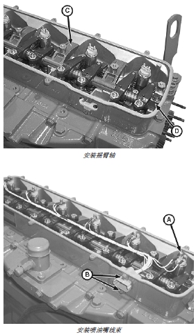 4. 用機油潤滑搖臂部件和推桿座,確保部件靈活轉動(dòng)。將兩端的卡箍螺釘涂上 LOCTITE® 242 螺紋緊固劑和密封劑。按技術(shù)規格的要求擰緊搖臂軸兩端的卡箍(D)。
