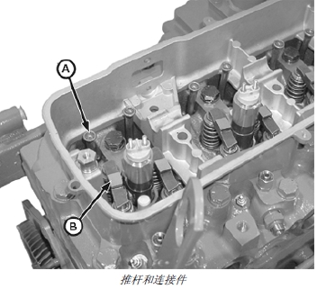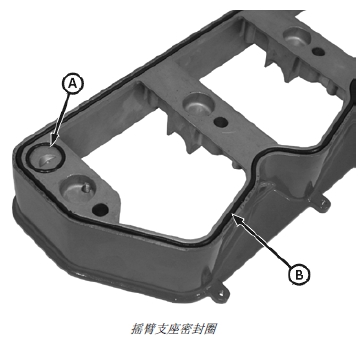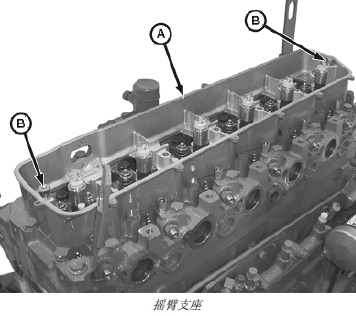 重要提示: John Deere約翰迪爾強鹿柴油發(fā)動(dòng)機或缸蓋大修期間,每次拆下支座后,都要更換 O 形密封環(huán) (B) 和搖臂供油O 形環(huán) (A)。