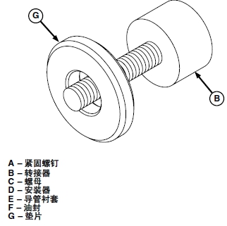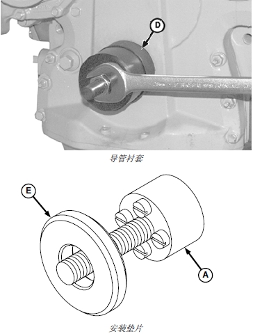 注意: 一些過(guò)去生產(chǎn)的正時(shí)齒輪蓋,導管襯套上有一個(gè)凹槽,可允許鑄造的標記通過(guò)。6. 將 JDG954-1 安裝器 (D) 放在轉接器上。將 JDG954-