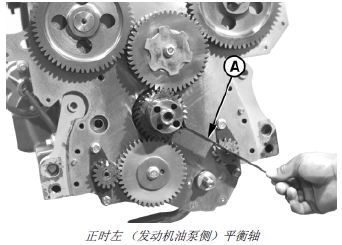 10. 轉動(dòng)左(噴油泵一側)平衡軸,使齒輪上的正時(shí)標記與 JD254A (JD-254A)1 正時(shí)工具 (A) 對齊。