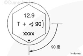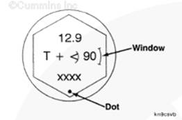 為了精確地使螺釘轉動(dòng)到要求的角度,使螺釘與螺釘頭上標記的“小圓點(diǎn)”和“窗口”對正,或者使用推薦的扭矩角度計 - 19 mm [3/4-in] 驅動(dòng)頭(零件號 3823878)或等同物。