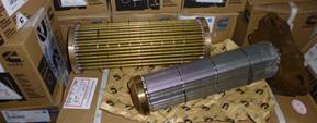 康明斯KTA發(fā)動(dòng)機采用內置式板翼式,置于發(fā)動(dòng)機水道腔體內,直列與V形機型的區別在于:直列機型機油冷卻器芯置于機體側部水道腔體內, V形機型機油冷卻器芯置于V型機體中部水道腔體內。)M11發(fā)動(dòng)機采用整體管束式冷卻器,置于發(fā)動(dòng)機排氣管側。