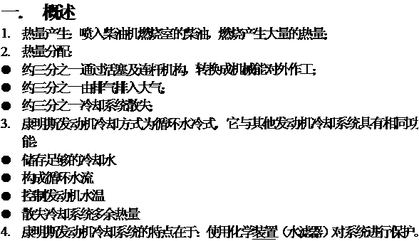 由散熱器、水泵、氣缸體水道、氣缸蓋水道、出水管、節溫器、水濾器、中冷器、機油冷卻器、以及選用件空氣壓縮機、液壓油冷卻器。