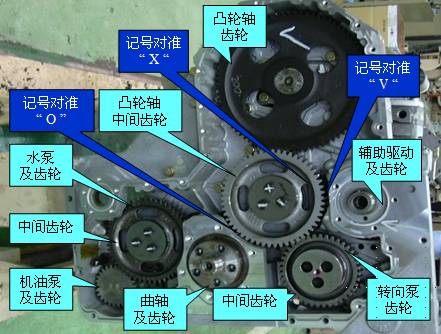 1.正時(shí)齒輪系:由曲軸齒輪、凸輪軸齒輪、輔助驅動(dòng)齒輪以及中間齒輪等構成;由曲軸齒輪將運動(dòng)傳遞給凸輪軸齒輪、輔助驅動(dòng)齒輪,并由正時(shí)記號建立相互間的轉角關(guān)系,其中心距和齒側間隙由設計保證,裝配時(shí)勿需調整。