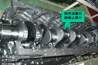 (5)在第四道主軸頸處裝有止推軸承,止推軸承有四片,下止推片有定位凸臺,裝配時(shí)油槽面向曲軸。