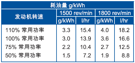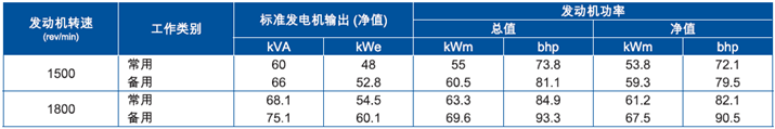 上表所有額定功率數據均為IS0 8528/1、IS0 3046/1:1986、BS5514/1條件下的發(fā)動(dòng)機性能。在其他條件下工作時(shí),性能可能降低。有關(guān)上述條件以外工作的數據,請向Perkins公司咨詢(xún)。Perkins提供的發(fā)電機輸出功率為標準數據,并根據平均標準交流發(fā)電機效率及0.8功率因數(cos.q)厘定。