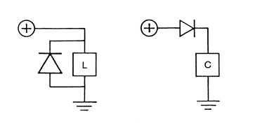 左圖為L(cháng)-電路和C-電路續流二極管的接法, 對于存在L-電路和C-電路的地方必須接續流二極管,以防止脈沖電壓的產(chǎn)生,從而引起電路其它元件的損傷.