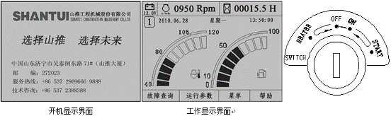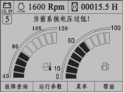 啟動(dòng)開(kāi)關(guān)分為三個(gè)檔位,分別為OFF檔,ON檔和START檔。當啟動(dòng)開(kāi)關(guān)處于OFF檔時(shí),系統處于斷電狀態(tài);當插入鑰匙,把啟動(dòng)開(kāi)關(guān)從OFF檔打到ON檔時(shí),監控系統得電,監控儀表顯示短暫的開(kāi)機界面后,進(jìn)入工作顯示界面,如圖所示。此時(shí)把啟動(dòng)開(kāi)關(guān)從ON檔打到START檔,待發(fā)動(dòng)機啟動(dòng)后松開(kāi)鑰匙,啟動(dòng)開(kāi)關(guān)將自動(dòng)退回ON檔。