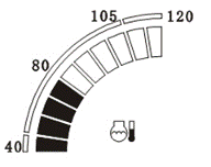 監控儀表工作顯示界面直觀(guān)顯示發(fā)動(dòng)機冷卻液溫度,如圖所示。顯示范圍為40℃~120℃十段,可根據段位監控冷卻液溫度。如要查看具體精確數值,請參閱運行參數。