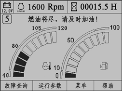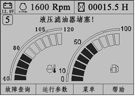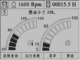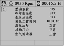 2)燃油油位;3)機油壓力;4)液壓油溫;5)轉速;6)空氣濾清堵塞;7)預熱指示;8)充電及系統電壓指示;9)各種工作狀態(tài)等。
