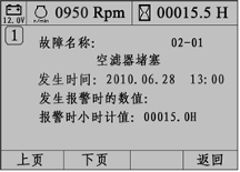 監控儀表具有記錄故障的功能,在工作界面按F1鍵可以進(jìn)入故障查詢(xún)界面,如圖故障查詢(xún)界面所示。在故障查詢(xún)界面按F1、F2鍵可以分別進(jìn)行上頁(yè)、下頁(yè)操作,查詢(xún)每次故障報警信息。按F4鍵返回到工作界面。