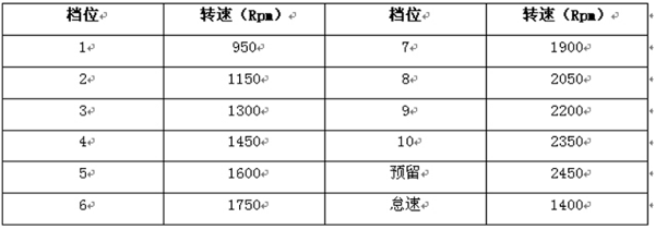 油門(mén)檔位分為1~10十個(gè)檔位,拔動(dòng)油門(mén)拔盤(pán)可調整當前油門(mén)檔位,順時(shí)針?lè )较虬蝿?dòng)油門(mén)拔盤(pán),油門(mén)檔位增大,逆時(shí)針?lè )较驌軇?dòng)油門(mén)撥盤(pán),油門(mén)檔位減小。油門(mén)檔位在監控儀表工作顯示界面左上角顯示,例如顯示界面顯示當前油門(mén)檔位是1檔。隨著(zhù)油門(mén)檔位增加,轉速作對應的增加,詳見(jiàn)如下表格。