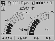 啟動(dòng)開(kāi)關(guān)打到預熱檔,發(fā)動(dòng)機開(kāi)始預熱,工作顯示界面提示“預熱進(jìn)行中!”文字提醒。保持預熱15秒后,預熱完成,工作顯示界面提示“預熱完成!”文字提醒,如圖所示。
