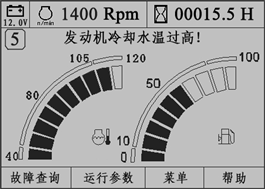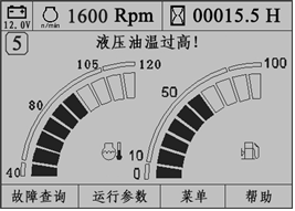 如果液壓油溫度達到85℃,約10秒鐘后,監控儀表提示“液壓油溫過(guò)高!”文字報警,監控儀表面板上液壓油油溫報警指示燈閃爍,同時(shí)蜂鳴器鳴叫,如圖所示。