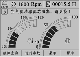 啟動(dòng)發(fā)動(dòng)機后,如果空氣濾清器堵塞,監控儀表提示“空氣濾清器濾芯阻塞,請更換!”文字報警,監控儀表面板上空濾報警指示燈閃爍,同時(shí)蜂鳴器鳴叫,如圖所示。