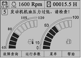 啟動(dòng)發(fā)動(dòng)機后,如果機油壓力過(guò)低,監控儀表提示“發(fā)動(dòng)機機油壓力過(guò)低,請檢查!”文字報警,監控儀表面板上機油壓力報警指示燈閃爍,同時(shí)蜂鳴器鳴叫,如圖所示。