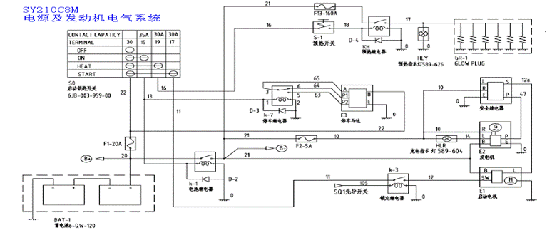 SY210C8M啟動(dòng)由上述控制電路獨立完成,控制器不參與啟動(dòng)控制。發(fā)動(dòng)機啟動(dòng)達到標準轉速后,將由發(fā)電機P端控制安全繼電器,安全繼電器則斷開(kāi)啟動(dòng)繼電器,起動(dòng)后啟動(dòng)繼電器不再輸出。此時(shí)控制器完成發(fā)動(dòng)機的發(fā)動(dòng), 充電報警燈熄滅。
