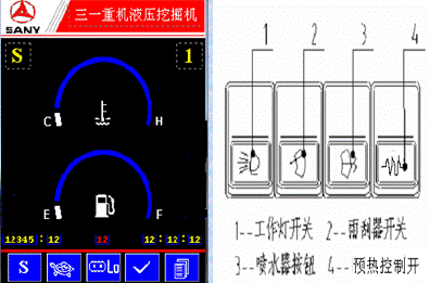 l 右操作面板黃色指示燈為發(fā)動(dòng)機預熱指示燈,通過(guò)閉合位于后面的翹板開(kāi)關(guān),并將點(diǎn)火開(kāi)關(guān)打到ON-START之間的預熱位置,此時(shí)指示燈亮,表示開(kāi)始預熱。