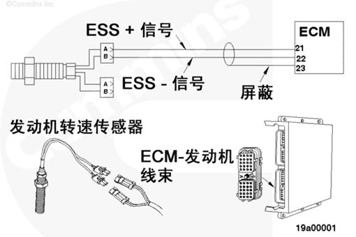 發(fā)動(dòng)機線(xiàn)束電子控制模塊 (ECM) 接頭的發(fā)動(dòng)機轉速傳感器 (ESS) 信號觸針 21 和 22 表明發(fā)動(dòng)機轉速超過(guò)報警(停機)閾值。