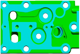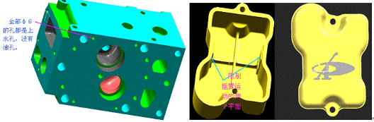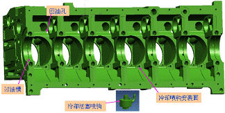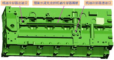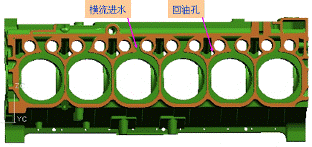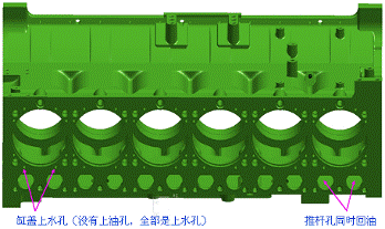 玉柴氣缸體-底面視圖:主油道通副油道的過(guò)渡由主軸承孔開(kāi)槽來(lái)實(shí)現,不必另外布置油道,結構簡(jiǎn)單。