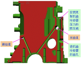 主、副油道鉆兩個(gè)斜孔,并通過(guò)主軸承孔連通,實(shí)現副油道供冷卻噴鉤的機油和潤滑油泵的機油。