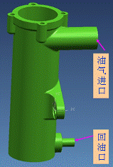 油氣有一定速度沿切線(xiàn)進(jìn)入油氣分離器并做旋轉運動(dòng),在離心力的作用下,油滴被甩到分離器的壁上,由下面的回油孔回到油底殼油面以下