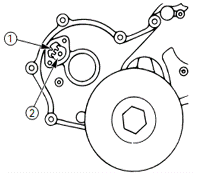 •          順時(shí)針?lè )较蜣D到曲軸,使凸輪軸正時(shí)觀(guān)察孔指針①和凸輪軸正時(shí)齒輪標記“O”對齊
