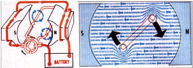 l          把電路環(huán)線(xiàn)置于兩磁極中。電流流向:蓄電池正→磁極線(xiàn)圈→ 碳刷→ 換向器→電路環(huán)線(xiàn) → 換向器→碳刷 →蓄電池負