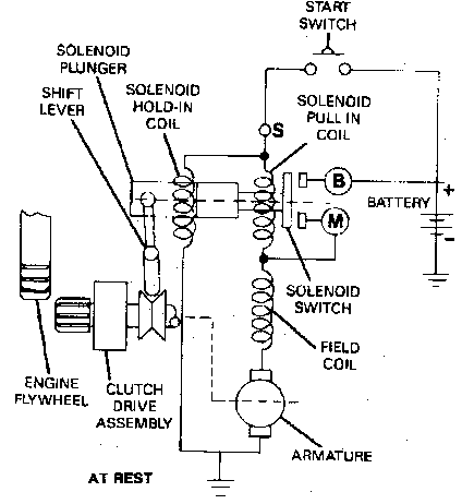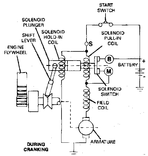 l          當起動(dòng)開(kāi)關(guān)斷開(kāi)時(shí),電流瞬間(從M點(diǎn)到S點(diǎn)到電池負)流過(guò)吸入線(xiàn)圈和保持線(xiàn)圈.