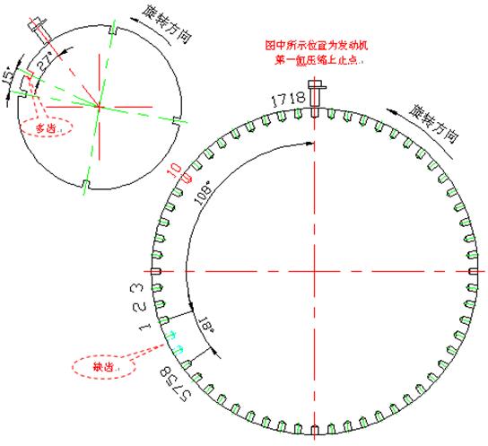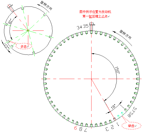 Ø      曲軸傳感器應該指示到曲軸信號盤(pán)缺齒后的第36個(gè)齒(參見(jiàn)圖中齒的編號),或第2個(gè)齒后210°(曲軸轉角)的位置(圖中所示標注150°=360°-210°)